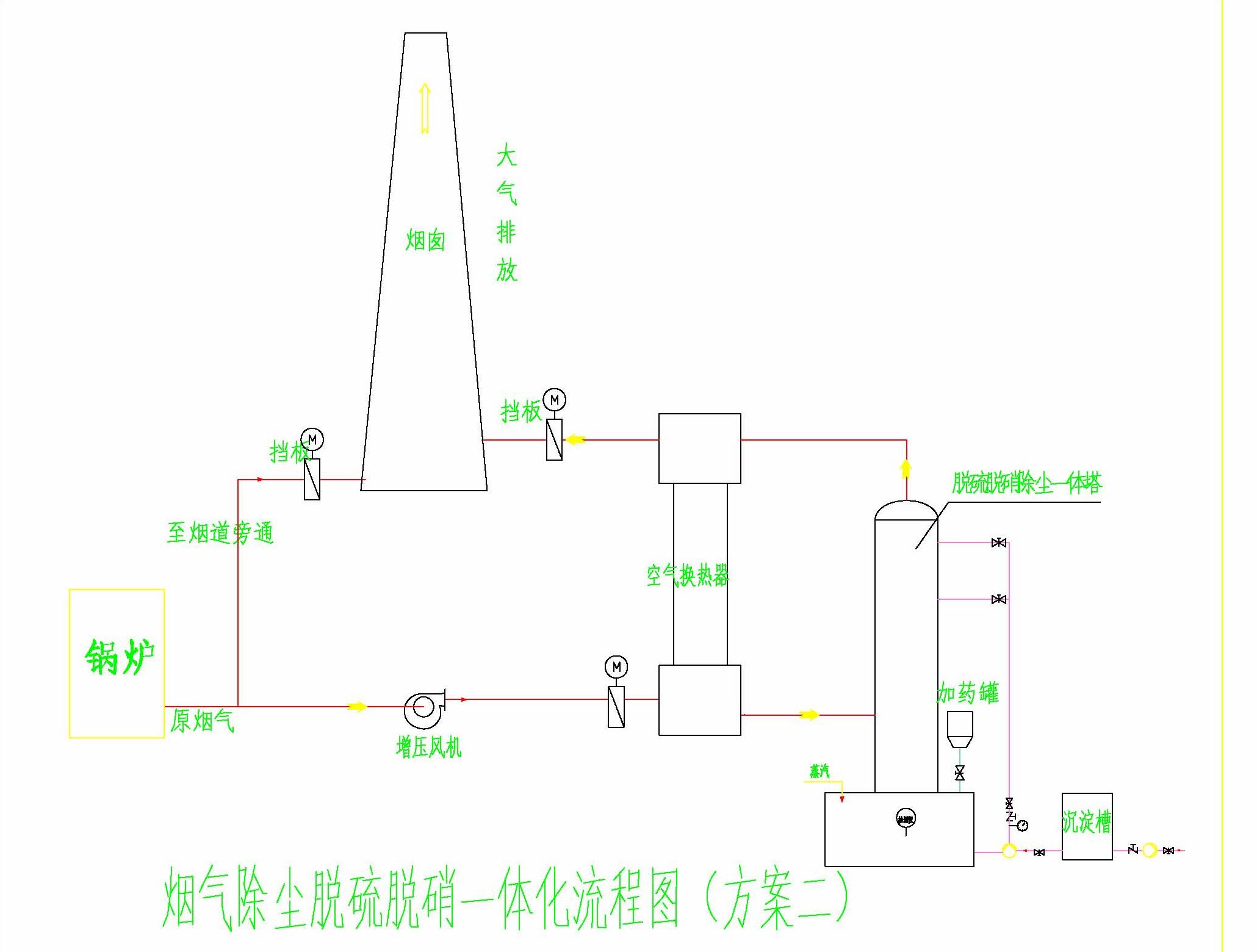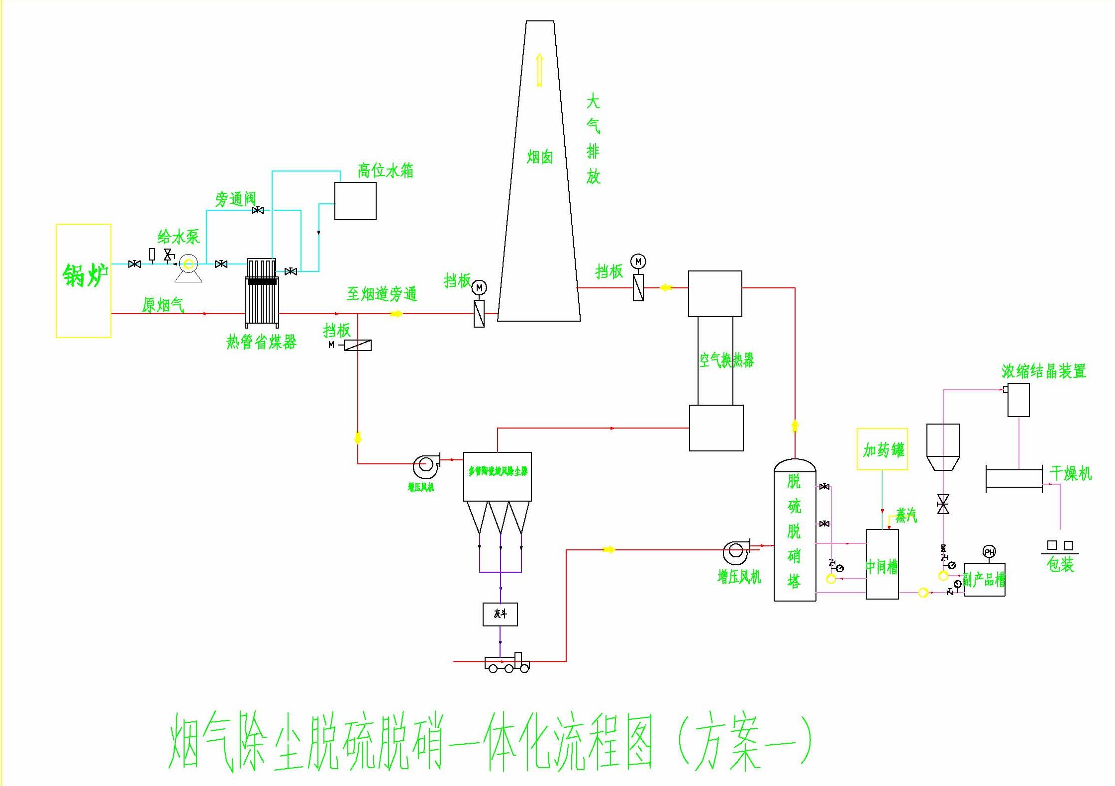 煙氣→余熱回收裝置(省煤器)→換熱器→除塵(根據(jù)情況確定)→脫硝脫硫除塵一體塔→換熱器→排放。(本流程僅供參考,我公司根據(jù)不同情況設(shè)計(jì)不同方案)