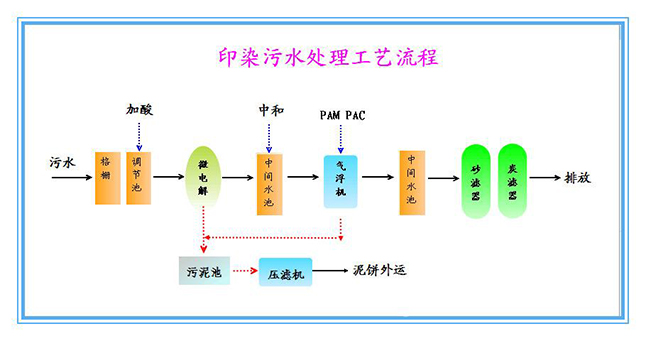 電解對處理含酸性染料的印染廢水有較好的處理效果,但對顏色深、CODcr高的廢水處理效果較差。對染料的電化學(xué)性能研究表明,各類染料在電解處理時其CODcr去除率的大小順序為:硫化染料、還原染料>酸性染料、活性染料>中性染料、直接染料>陽離子染料,這種方法正在推廣應(yīng)用。