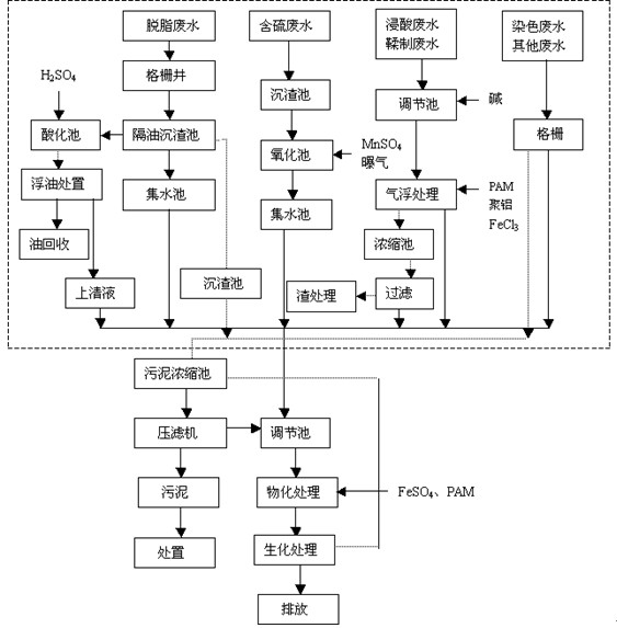 1、對(duì)于鉻鞣污水,采用以物化加藥處理為核心的處理工藝。預(yù)計(jì)經(jīng)加藥處理后,排水無色、透明,可滿足回用要求;