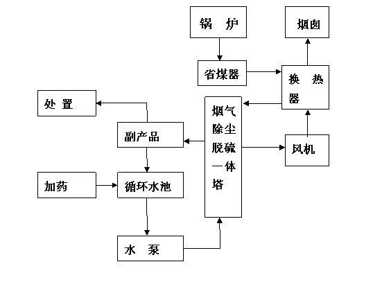 本方案設(shè)計流程:煙氣→余熱回收裝置(省煤器)→換熱器→脫硫除塵一體塔→換熱器→排放。
